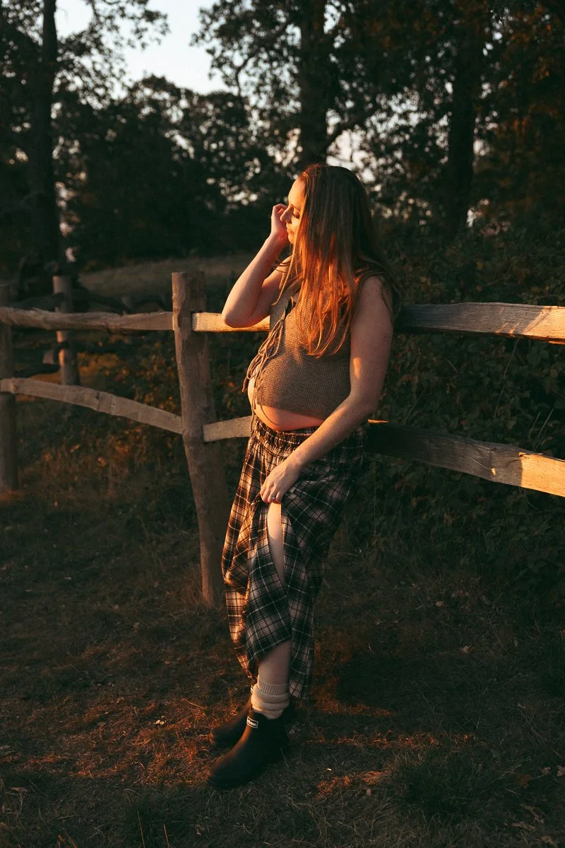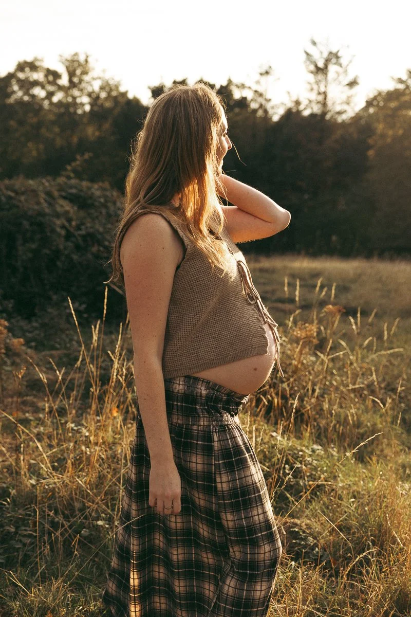 A soft floral, a gentle check, a subtle stripe — these can all work really well outdoors, particularly when you mix different scales of pattern and keep the tones muted. A small floral on a dress paired with a plain linen cardigan, or a fine check top with a simple solid skirt, adds depth without pulling focus from the bump or the setting.