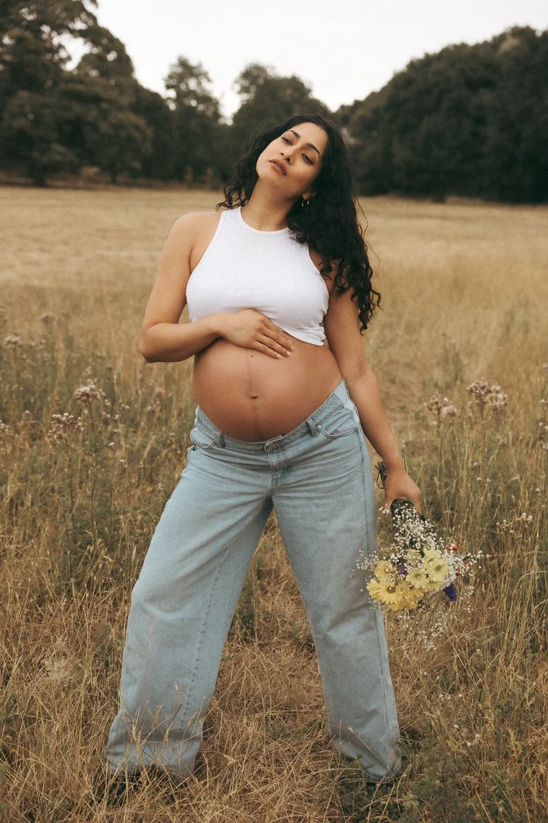 A long, flowing dress is the classic choice for a spring maternity photoshoot — and it works because it moves beautifully in a breeze, flatters every stage of pregnancy, and photographs elegantly against natural surroundings like Richmond Park's open meadows or woodland paths.