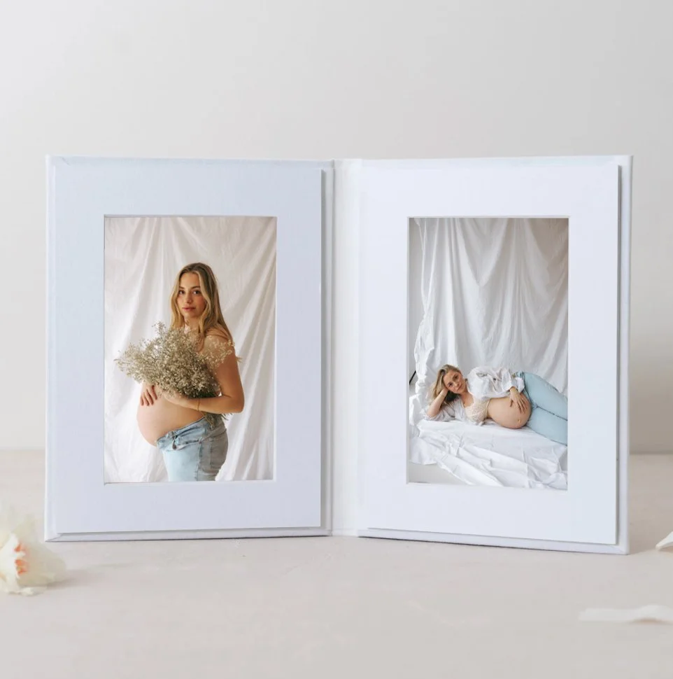 A beautifully handmade 8” portfolio, included with my Bump to Baby collection. It holds your two favourite images — printed on soft fine art paper and wrapped in elegant linen or cotton — perfect as a keepsake or gift. The cover can be personalised with your chosen words, making it as meaningful as the moments inside.